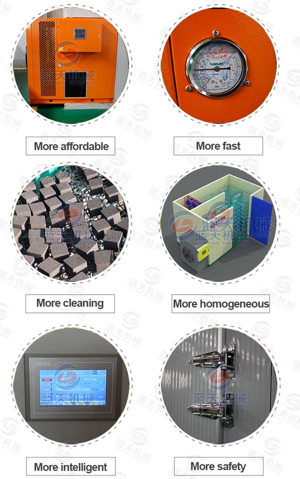our shisha charcoal dryer belongs to air energy heat pump dryer machine, when working, machines used inverse Carnot working principle, compressed air of compressor driven by electric energy can provide high temperature drying condition for drying room, PLC intelligent panel can adjust the drying room temperature, humidity and materials required for drying time.